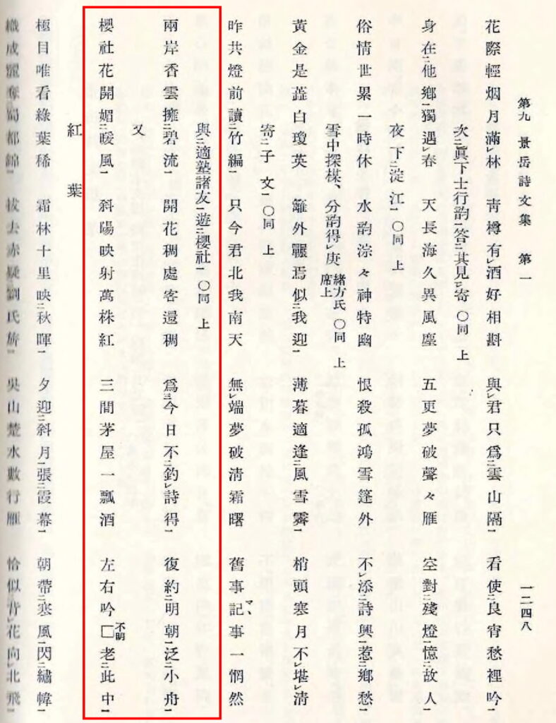 1850~51年,橋本左內17、18歲在適塾(大阪大學的前身)學習的時候的作品吧。 現在也作為大阪的八重櫻的名勝有名的造幣局本局內的櫻花的穿過(寬約560米)附近玩了吧。 從櫻宮神社附近的造幣局到櫻宮大橋一帶,現在好像也移植到了櫻之宮公園。 在《橋本景嶽全集》下,“詩”字不明,但我認為沒錯。