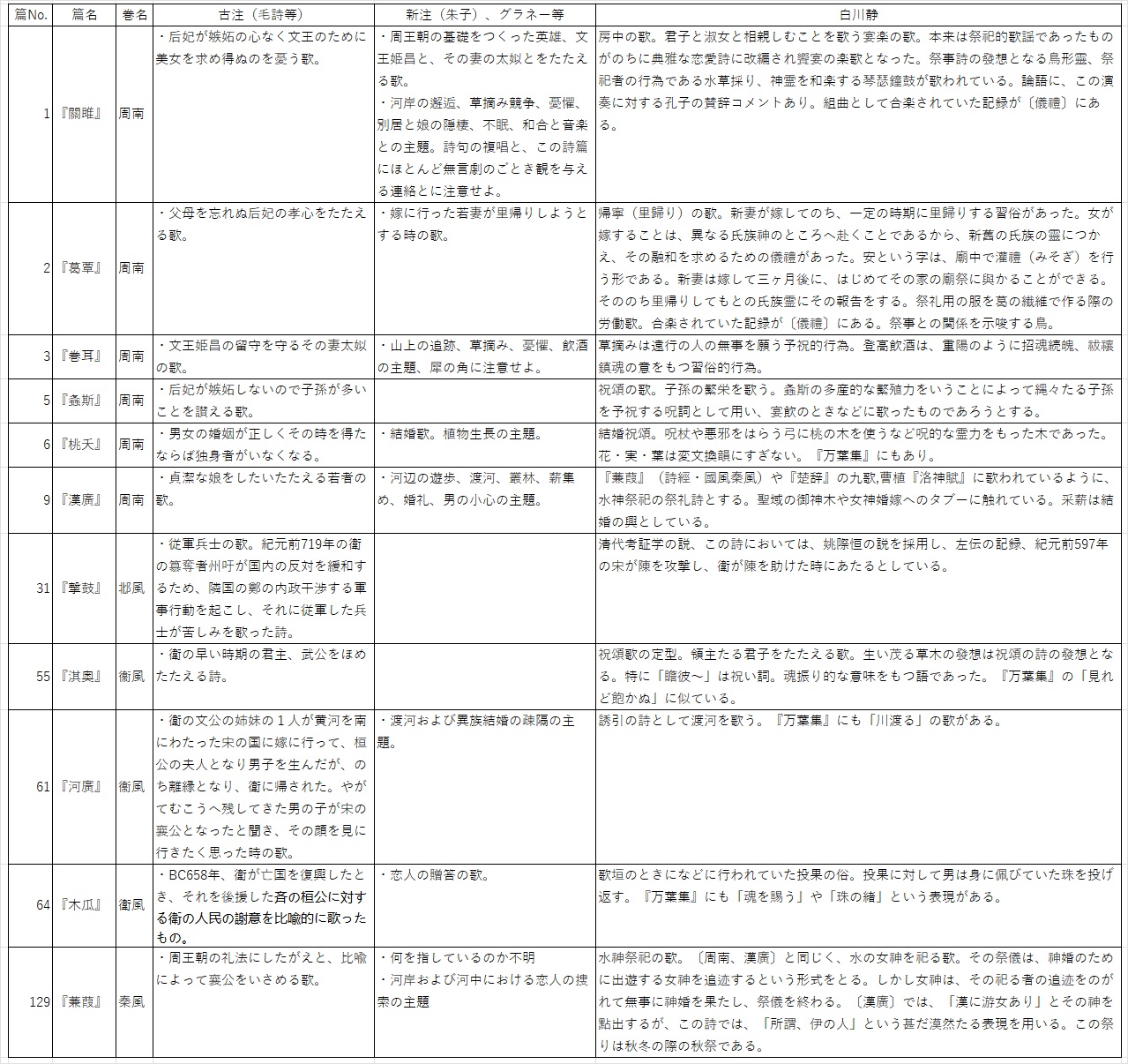 ただ、白川博士はこれらの研究を「比喩的にいえば、墓誌や地表の調査に終始していて、玄室内の調査には及ばなかった」としている。そして、玄室内の調査に、古代歌謡として、歴史学的方法と民俗学的方法を試みたとしている。グラネーによる宗教社会学的研究や松本雅明氏や聞一多氏による発生史論的、解釈学的試みの成果を認めながらも、旧説の道徳的解釈などを拒否しただけとして、民俗学的課題としてとらえたり、金文などの同時資料や民謡から展開した古代歌謡としての社会的背景を同じくする『万葉集』との対比を通して解明しようとした。