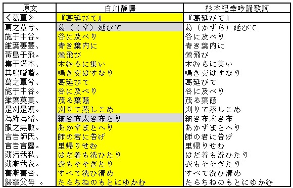 注目していた日本語訳詞ですが、やはり白川静訳は、ほぼパーフェクトに、楊芬さんの旋律をもとにした伴奏の上で歌うことができました。改変した場所は、『關雎』よりも少なく、「細き布太き布とり」の「とり」の除いただけでした。