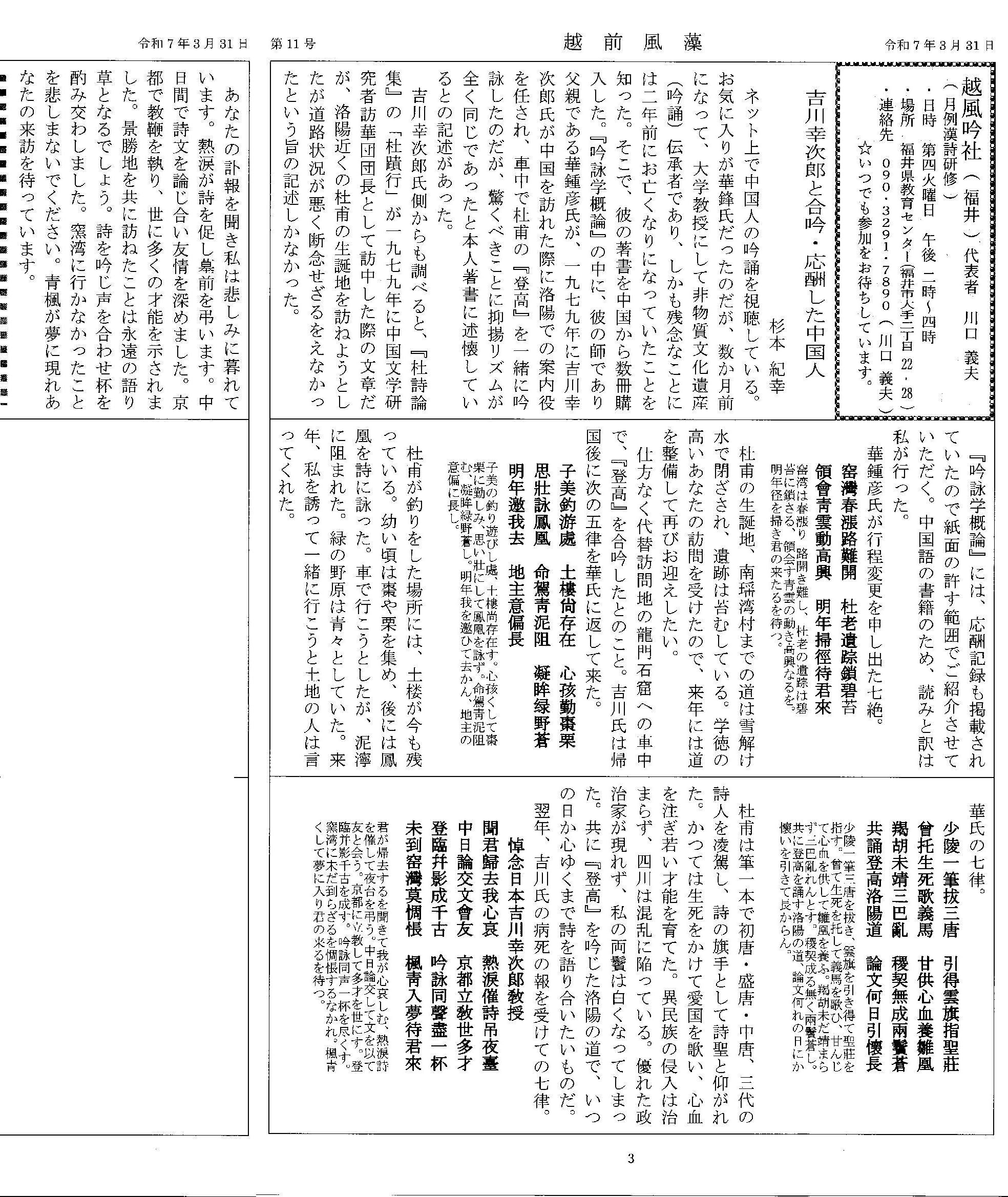 このサイトの吟唱作品を作成するにあたり、取り入れさせていただいているベスト3吟誦家の華鋒さん(『汪倫に贈る』『岳陽楼に登る』)の著書を入手したことで興味深い事実を知ることができ、福井県漢詩人協会の機関紙『越前風藻』に越風吟社の一員として投稿させていただきました。