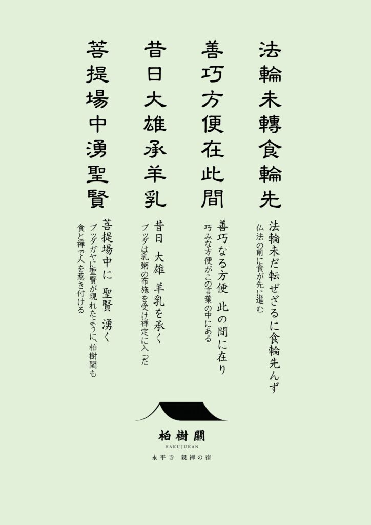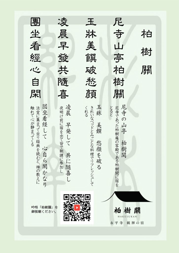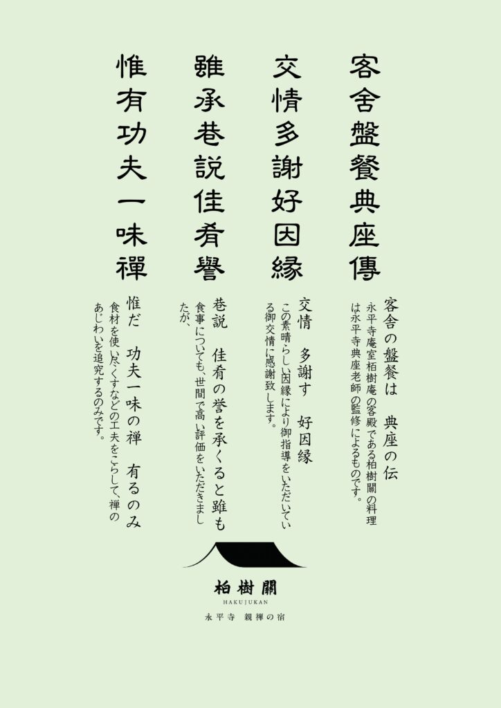 次の画像は、柏樹関の精進料理の指導をしてくださった当時の典座・三好良久老師が、定期的に点検指導をしてくださることへの感謝と、ミシュランの星をいただいた上での気を引き締めていく覚悟を表した自作漢詩です。